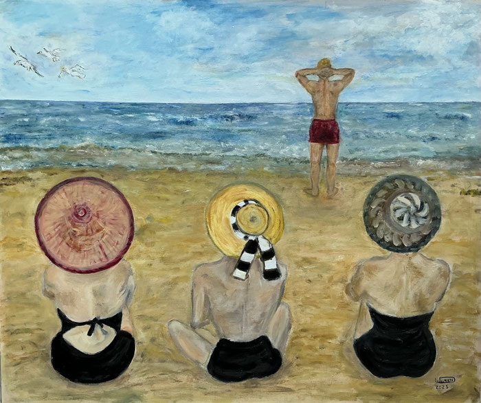 De titel stelt een speelse, bijna filosofische vraag. Wat zien we hier echt: Is het de rust en oneindigheid van de zee die de vrouwen boeit en aantrekt? Of zijn hun ogen – en gedachten – eigenlijk gericht op de man die daar staat?