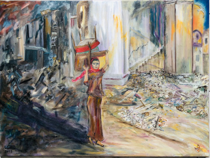 Zij die verder gaat is meer dan een visuele weergave van conflicten en oorlogen. Het is een ode aan hen die, ondanks alles, doorgaan. Die het oude moeten loslaten en het onbekende tegemoet moeten treden. De vogel is het symbool van een vrijheid die niet volledig verloren is gegaan. De vlinder een teken van transformatie, van innerlijke groei ondanks de omstandigheden.