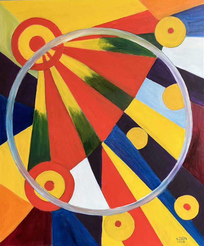 Het schilderij verbeeldt het leven in een spel van cirkels, driehoeken en vierhoeken met in het midden een grote cirkel die als hart fungeert. De vier banen staan voor verbinding en het uitbundige kleurgebruik benadrukt positiviteit en levenslust. De donkerdere vlakken contrasteren met de heldere kleuren en herinneren eraan dat ook moeilijke momenten deel uitmaken van het bestaan.